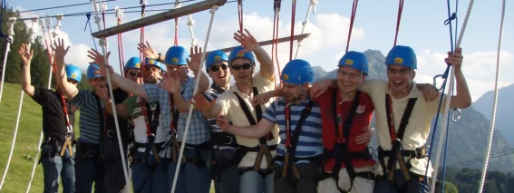 Faites avec nous l'expérience de formation d'équipe unique dans l'Audi Arena Oberstdorf. Avec les éléments polyvalents des parcours aventures, haut et bas, de notre Skywalk ainsi que divers autres modules, tels que le biathlon, le saut à ski et des activités autour du saut à ski, élargissez à coup sûr les horizons de l'équipe. Entre les tours des tremplins du saut à ski, nous combinons des éléments de programme inoubliables et concevons des expériences stimulantes en fonction de votre thématique. C'est ainsi que nous parvenons à connecter votre équipe avec une émotion positive sur le long terme.