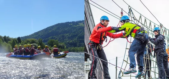 Für den Bergwald-Parcour treffen wir uns im Wald-Seilgarten am Allgäuer Berghof in Gunzesried. Hier erfolgt die Ausrüstung der Teilnehmer mit Klettergurt und Helmen und eine Sicherheitseinweisung. In Kleingruppen oder im Team werden Herausforderungen an verschiedenen Stationen bewältigt. Für das Raften treffen wir uns an unserem ICO Outdoor Center Allgäu. Unser Outdoor Center Allgäu liegt direkt an der Iller. Hier findet die Einweisung durch unsere Guides statt und die Teilnehmer werden mit Neoprenanzügen, Schwimmwesten und Helmen ausgestattet. Unser Outdoorcenter bietet höchsten Komfort mit Umkleiden, Duschen, Kicker, Bar und Lounge Ecke. Die Iller wechselt zwischen ruhigen und anspruchsvolleren Flussabschnitten. Dabei paddeln Sie stets vor dem schönen Panorama der Allgäuer Alpen. Nach dem Bergwald-Parcour und der Rafting Tour lädt das Center zum Verweilen ein. Der Kletterpark ICO Skywalk befindet sich in der Audi-Arena in Oberstdorf. Zwischen den Schanzentürmen erfolgt die Einweisung und Ausstattung mit Klettergurten und Helmen. Im Boden-, Team- und Himmelsparcpur werden spannenden Herausforderungen bewältigt. Unvergessliche Höhenflüge mit viel Spaß und Adrenalin vor dem Bergpanorama der Allgäuer Alpen warten auf Sie.