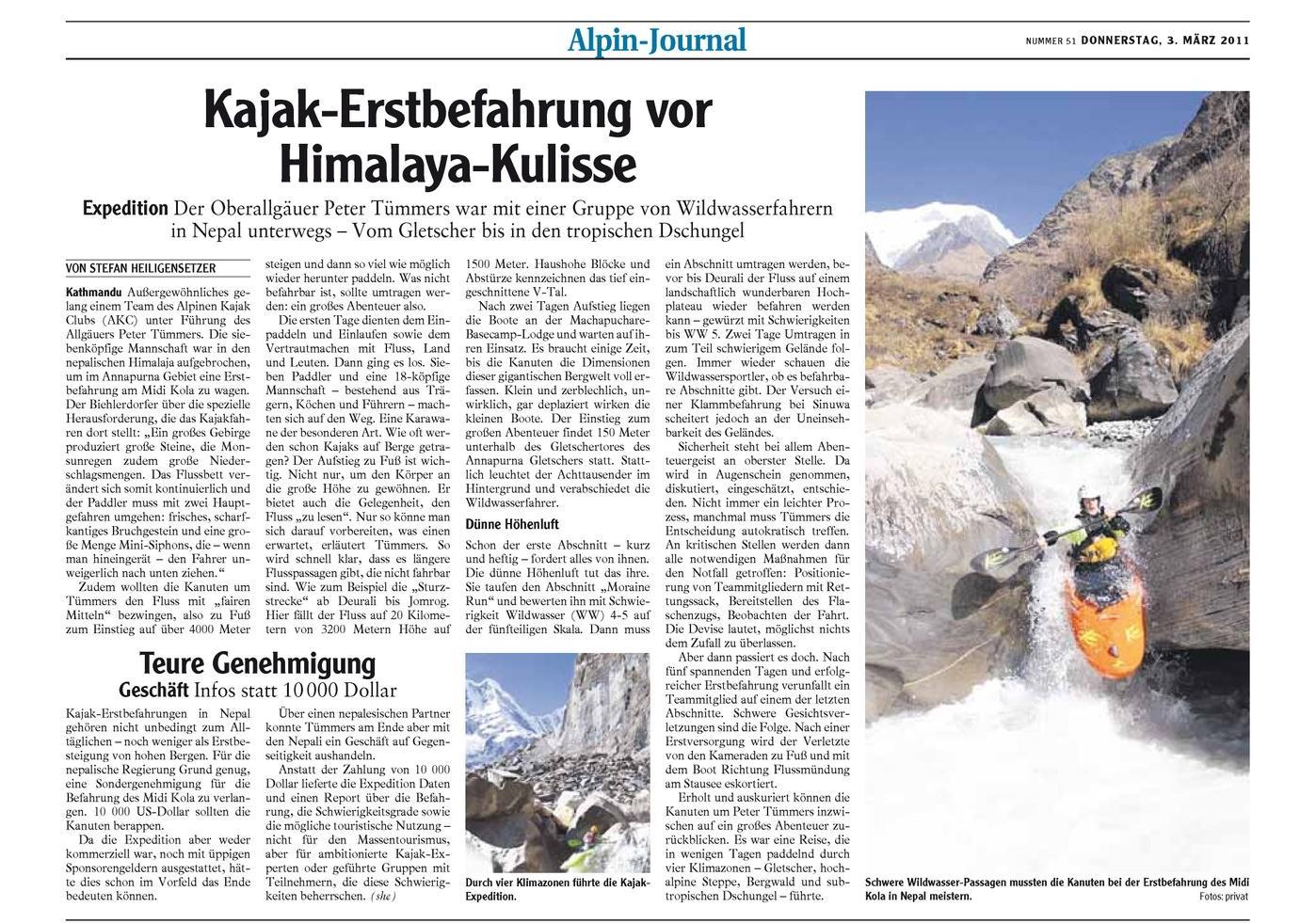 Allgäuer Zeitung: Kajak-Erstbefahrung im Himalaya durch Peter Tümmers und Team